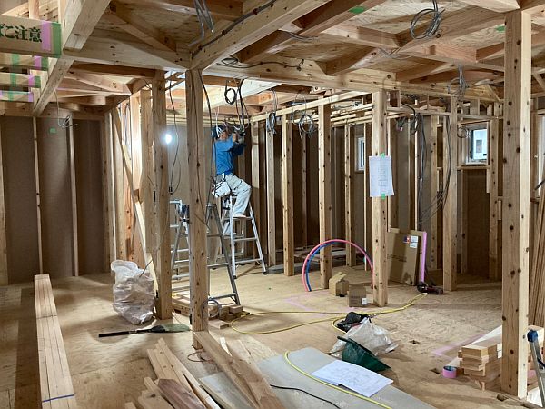 上棟打ち合わせのひとコマパート3。といっても、この写真は上棟打ち合わせが無事に終わった夜の写真。上棟打ち合わせで変更になった箇所を早速変更している電気工事の職人さんです。電気の配線工事が終わり次第、断熱工事の準備が始まります。