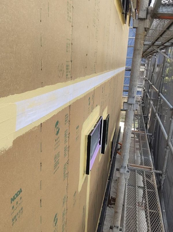 前置きが長くなってしまいました。NA様邸の施工レポートに戻ります。下の写真は、下地材と下地材の継ぎ目と、下地材と窓サッシの継ぎ目部分の隙間をなくすための作業の様子です。