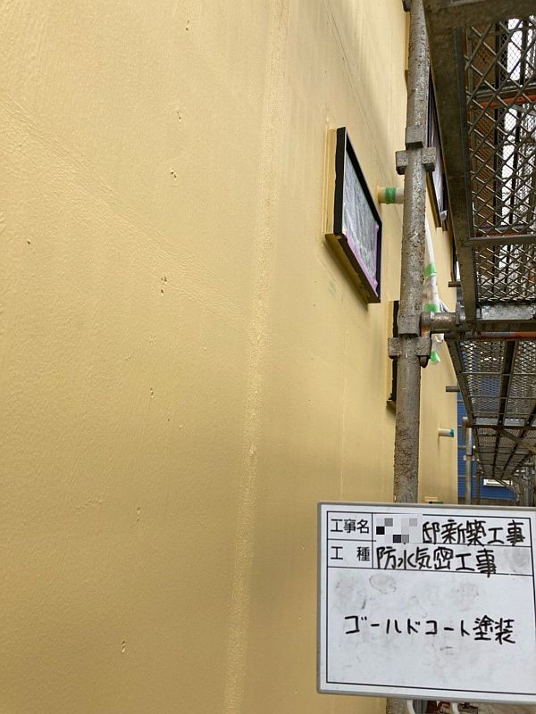 数日後、建物全体にゴールドコートの一度塗りを行いました。ゴールドコートは二度塗りが基本なので、完全に乾くのを待ってからもう一度塗ります。