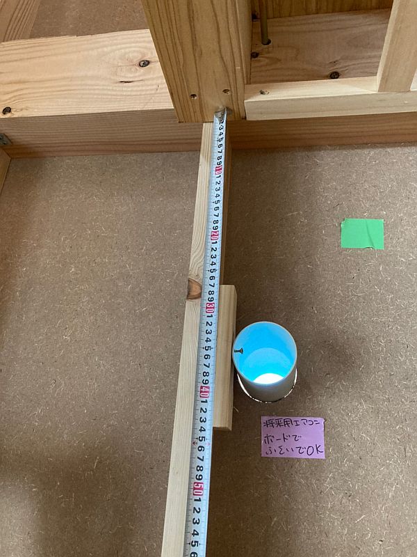 下の写真は、将来的な間取り変更に備えて、子供室の壁にあらかじめ開けたエアコン用の配管です。写真に写っているメモ書きにあるように、この後断熱材を充填してボードでふさぎます。