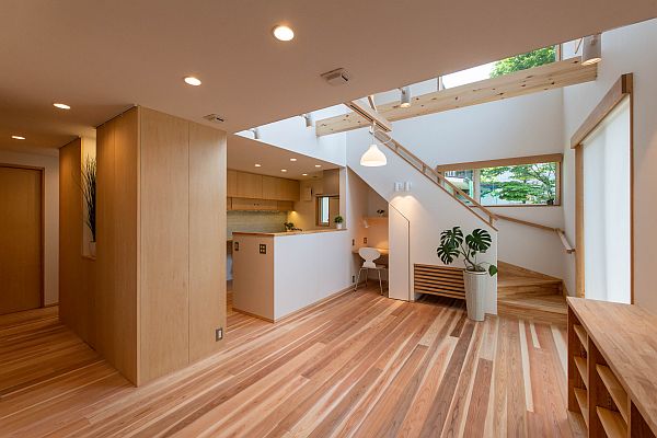 スタディカウンターのある2階ホール。右奥はロフトに上がる階段です。ロフトにエアコンが設置してあり、そのエアコンからの冷気が、天井のスノコから吹き抜けを通して家全体に降りるようになっています。