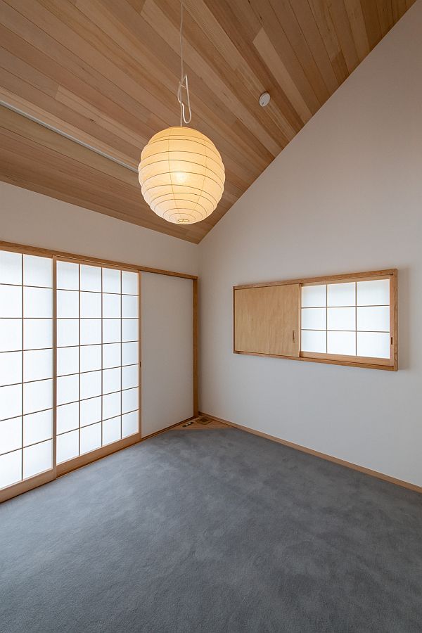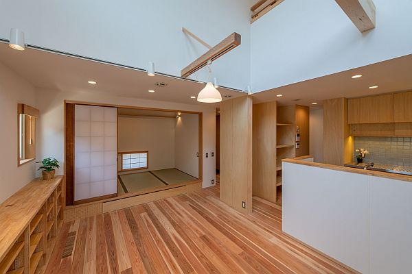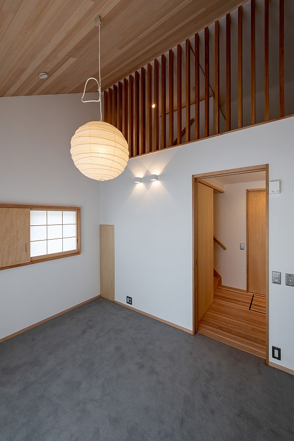 吹き抜けに突き出た細長い木枠の中には照明用のライティングレールを組み込んでいます。小上がりの和室の真上の部屋は、子世帯のセカンドリビングです(N様邸は三世帯同居のお住まいです)。和室の障子も吹き抜けに面したセカンドリビングの障子も、建て替え前の住まいにあった障子を再利用しています(もちろん紙は貼り替えています)。