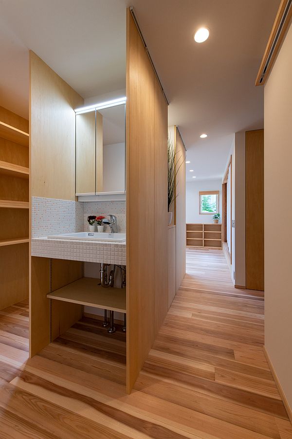 N様邸の独立洗面スペース。最近、脱衣室(ランドリールーム)と洗面スペースを別々の場所に設置されるご家庭が増えてきました。年頃の娘さんがお風呂に入っている間、家族のだれも洗面化粧台を使えない…というよくある問題が解消します。