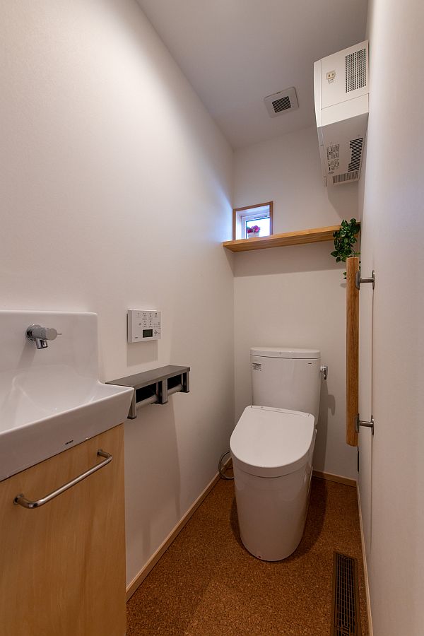 左側の収納一体型の手洗い器は既製品なのですが、N様邸の他の部屋の建具と色と素材を揃えるため、造作した扉に付け替えています。