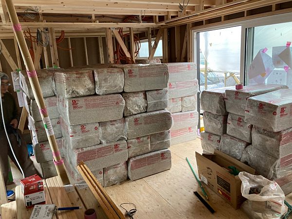 建築現場にアップルゲート社製のセルロースファイバーが到着しました。こちらは充填断熱(内断熱)用の断熱材です。大量のセルロースファイバーを壁内に充填することで、高い断熱性能を実現します。