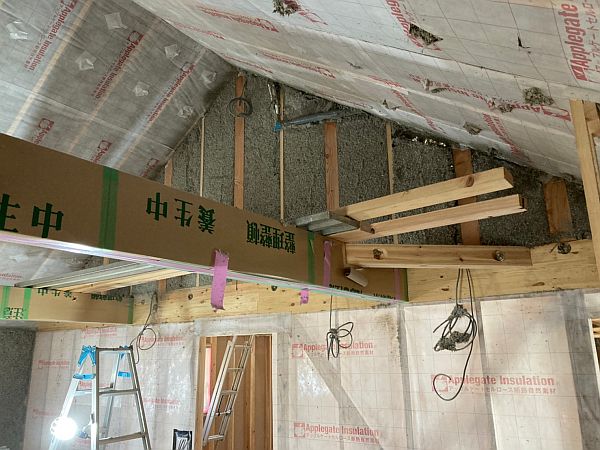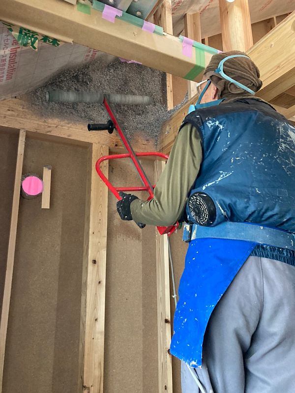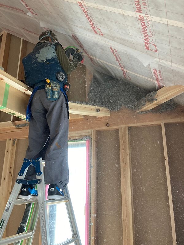 セルロースファイバーを専用の道具を使って、壁内に吹き付けていきます。一般的なセルロースファイバーと違って、アップルゲート社のセルロースファイバーにはトウモロコシから作られた天然の糊成分が添加されています。吹き付ける際に霧状のわずかな水分と混ぜ合わせることで、壁の中に固着させていきます。一般的なセルロースファイバーは時間が経つにつれて沈下してしまい、断熱層の上のほうに隙間ができてしまうという課題がありますが、アップルゲート社のセルロースファイバーにはその欠点はありません。