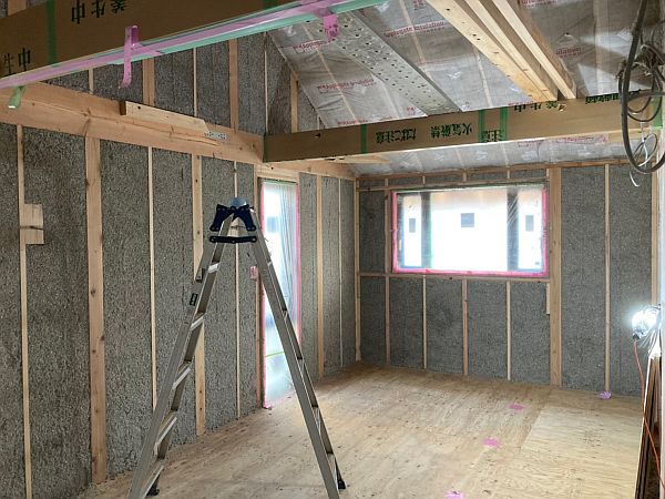セルロースファイバーを使用した充填断熱工事が終わりました。下の写真は1階の土間になるエリアです。