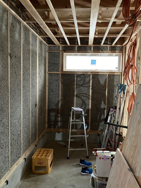 セルロースファイバーの充填が完了した2階の主寝室。セルロースファイバーは吸音・遮音性能に優れているので、断熱材を入れると建築現場が途端に静かになります。