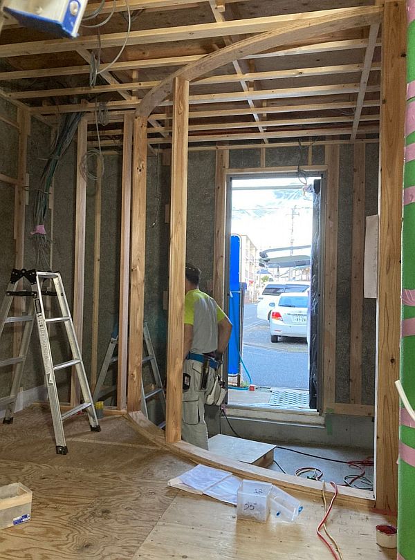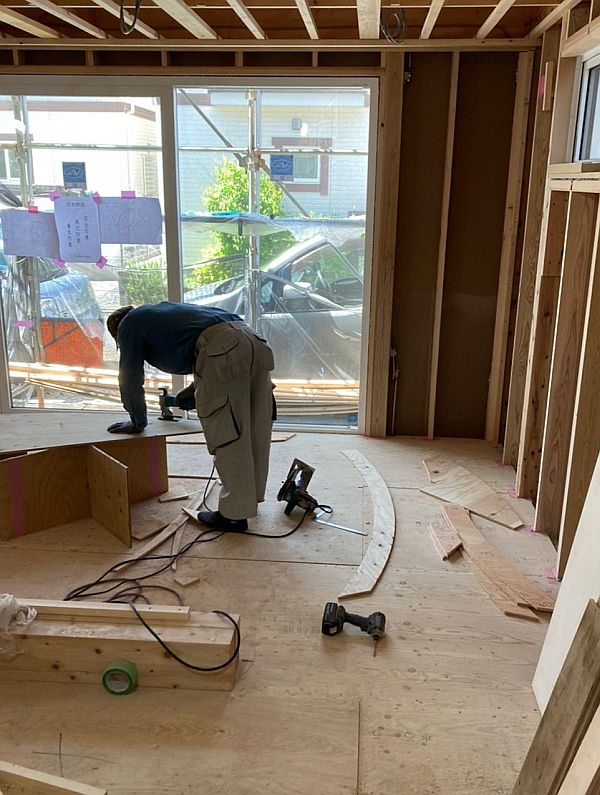 屋内の断熱工事が終わると、大工工事が一気に加速していきます。さてここでクイズです!下の写真の大工は何を作っているか、わかりますでしょうか?ヒントは足元の曲線形状の木片です。
