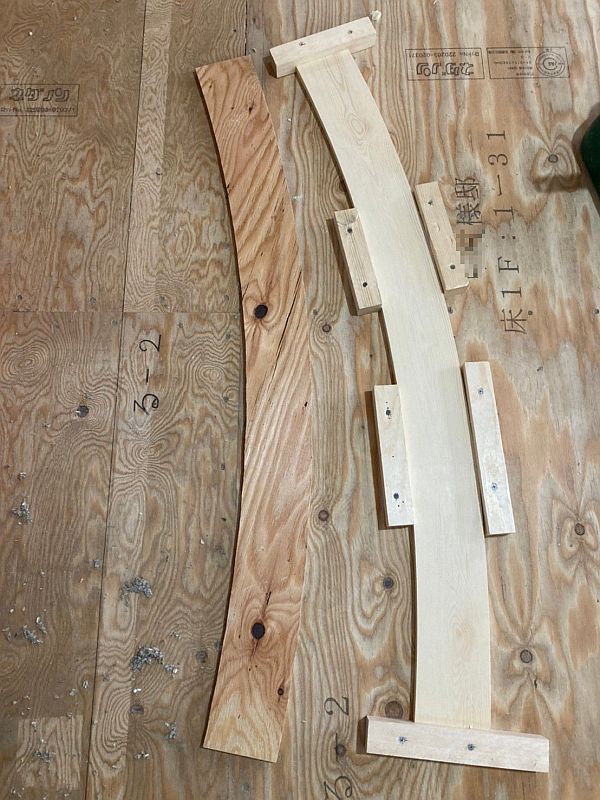 答えは、曲線状に仕上げる玄関土間の上がり框の部材を作っていたのでした。曲線状の上がり框は、同じようにカーブした複数枚の板を積み上げて作っていきます。(上がり框だけではなく、天井部分もつくる必要があります)
