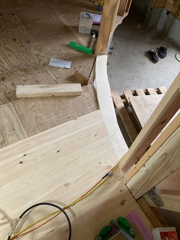 上がり框が曲線形状ということは、床材ももちろん曲線に仕上げる必要があります。細かな造作が続きますが、大工魂は燃えています。