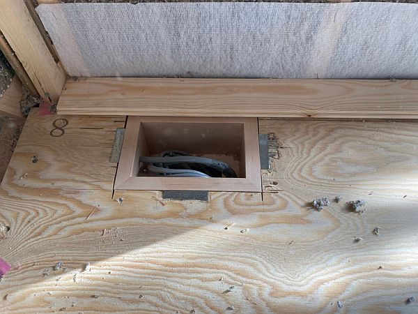 答えは床埋め込み型コンセントの配線ボックスです。既製品の埋め込みコンセントの場合、床から少し出っ張りますし、見た目が家全体の雰囲気に合わないこともあります。そういった理由からNA様邸では、床埋め込み型コンセントを造作しています。無垢の床材と一体化したデザインのコンセントボックスができあがる予定です。いずれブログで紹介しますので、乞うご期待ください。