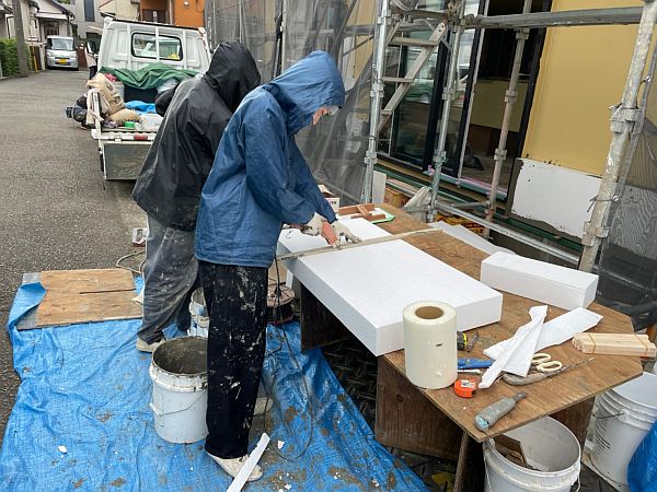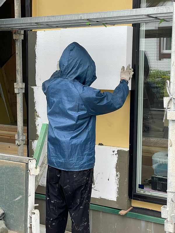 裁断したEPSボードを建物の外壁全体に貼り付けていきます。パズルのような作業です。