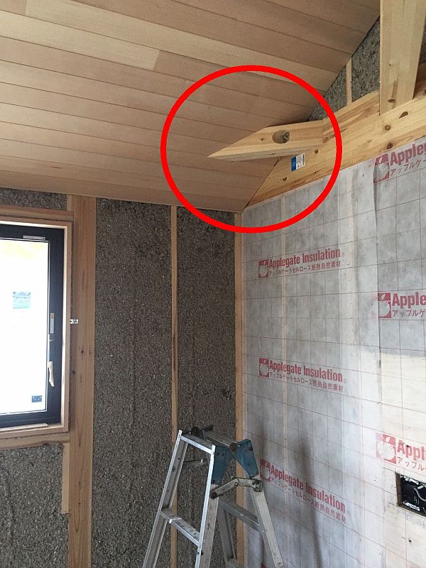 赤丸で囲んでいるのは、勾配天井の羽目板(はめいた)と火打梁(ひうちばり)の接合部分です。羽目板一枚一枚に切り欠きをしておさめていきます。会心の出来栄えだったようで、大工から「ここ写真撮っといてよ」とリクエストがあったので、載せておきます!