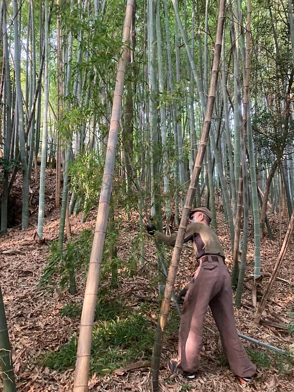 下の写真は、竹林で竹を切る職人さん(古川さん)です。七夕飾りに使うのでしょうか?あるいは流しそうめんに使うのでしょうか?