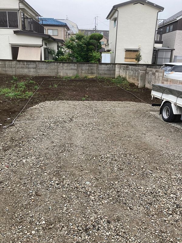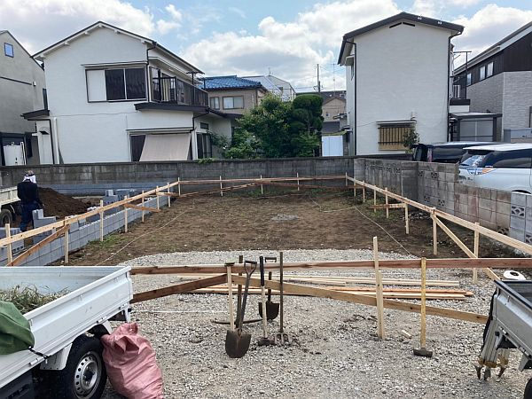 地鎮祭の前に、地縄張りを施したO様邸の敷地。地縄張りというのは、敷地の上に紐や水糸を使って建物の位置を表示する作業のこと。東京ではほとんどありませんが、土地に余裕のある地方だと、地縄張りをみて、「もう2メートル東側に」みたいなやりとりがあったりするそうです。