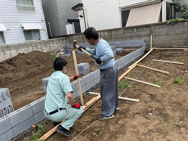 杭を打って「遣り方(やりかた)」を組んでいきます。遣り方は、建物の基礎の高さの基準になるとても大切なものです。レーザーレベル(レーザー水平器)を使って正確に水平を測りながら設置していきます。