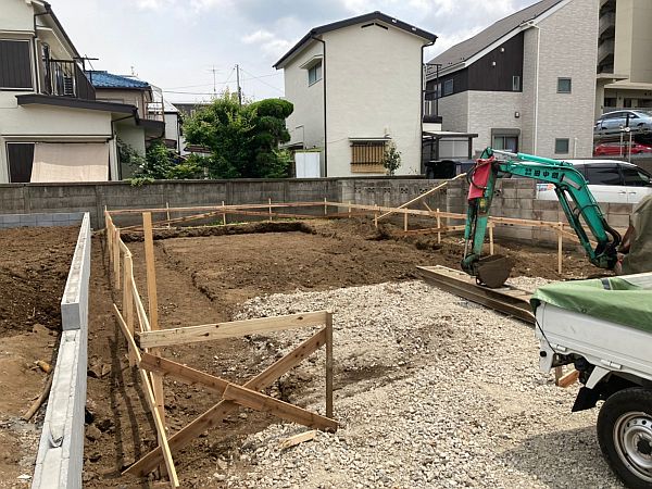 遣り方ができあがるといよいよ基礎工事が始まります。まずは小型ショベルカーを使って地面を掘り下げていきます。この工程のことを「根切り(根伐りと書くこともあります)」といったり、「床掘り」といったりします。この後、砕石を入れて、防湿シートを貼って、捨てコンクリートを打って…という流れになるのですが、それらは来月号でレポートしたいと思います。