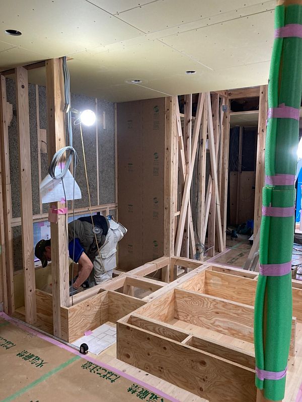 大工が小上がりの和室の土台部分を作っています。複雑な形状になっているのは、段差部分に2つの引き出し収納と、ルンバの収納基地を作るためです。