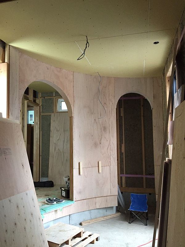 玄関土間に設けた2つのアールの下がり壁。左側が家に上がる入口、奥が土間とサイクルラックの境界となる壁です。玄関の上がり框が曲線状なので、曲線に曲線を重ねたデザインということになります。建築士の遊び心ですが、どんな玄関ホールに仕上がるか、完成が楽しみです。ちなみに曲線状の壁は曲げベニアという強度を確保しつつ少し柔らかい材料を使って作っていきます。
