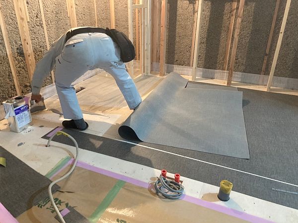 キッチンの床にフロアリュームという人工リノリウム素材を敷く職人さん。専用の接着剤で貼り付けていきます。NA様邸のリビングの床材は無垢のレッドパイン材(パイン材は、現在の世界情勢下、もうほとんど入って来ません。)ですが、キッチンの床と洗面ルームの床はメンテナンスの観点からフロアリュームを採用しています。