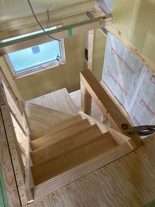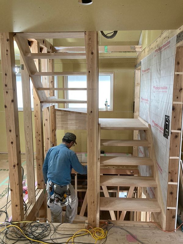 階段もできあがってきました。こちらは2階からロフトに上がるスケルトン階段です。右側の白いシートの中には断熱材のセルロースファイバーが詰まっています。階段の右側が主寝室なので、防音と遮音のためにセルロースファイバーを利用しています。