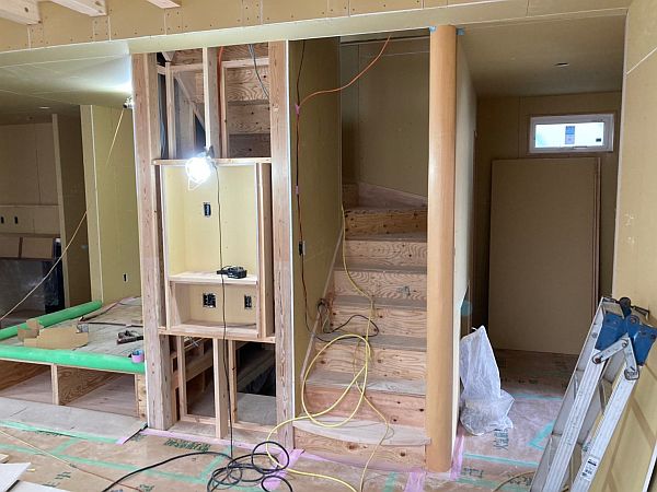 こちらは1階から2階に上がる階段です。こちらはスケルトン階段ではなく、蹴込み板のある階段ですが、絨毯を敷いて仕上げる予定です。最近は絨毯の復権というのでしょうか、ポイントポイントで絨毯を使うお客様が増えてきています。無垢の床材とはまた違った良さがあります。