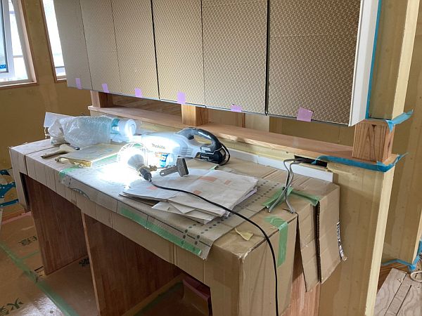 造作洗面台の施工も進んでいます。洗面台部分は造作ですが、ミラーはお客様からの支給品です(IKEAで購入されたものです)。