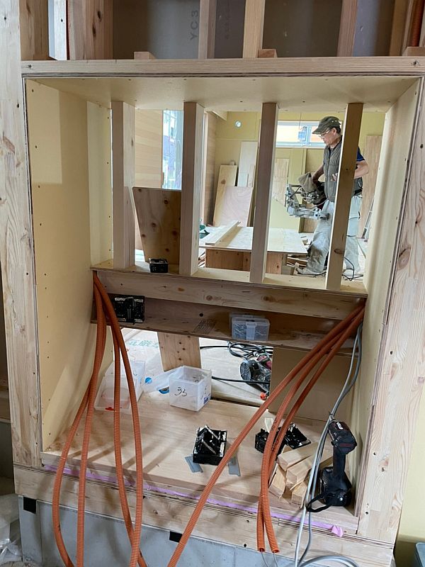 下の写真は、土間とリビングの間に設けた壁掛けテレビ用の背面金具収納ボックス兼AVラックです。壁掛けテレビの背面金具を壁の中に収納することで、壁掛けテレビを壁にぴったりくっつくように設置することができます。両側からたくさん突き出ているオレンジの管は様々なケーブルを通すためのCD管です。この後、これらすべての管と電線を真ん中の幅10センチほどの構造材の裏側に収めていきます。アイデアを思いつくのは簡単ですが、実現するのはなかなか大変です。ちなみにこの開口部はAV機器用のラックも兼ねていて、配線は土間側の扉を開けて行うようになります。