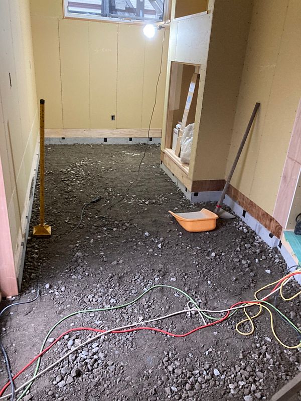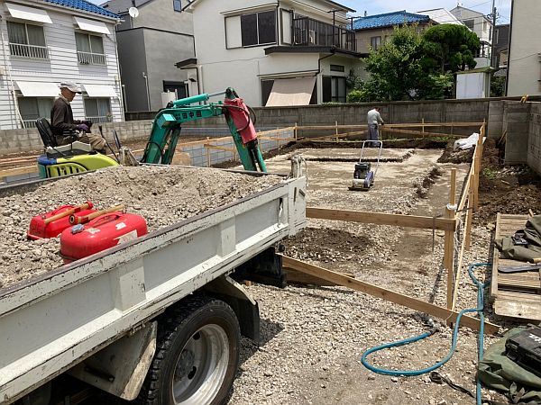 根切りした(掘り下げた)敷地に砕石を入れて、プレートコンパクターという機械で転圧していきます。この工程は日本全国どの建築会社も同じように行っています。