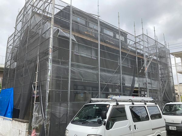 ガルデの二度塗りが終わりました。足場の解体が始まり、白い壁と黒い屋根のコントラストが目に鮮やかなNA様邸が姿を現しました。