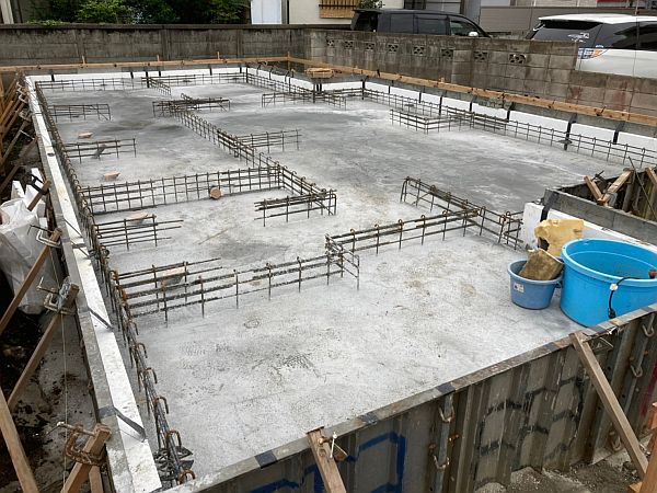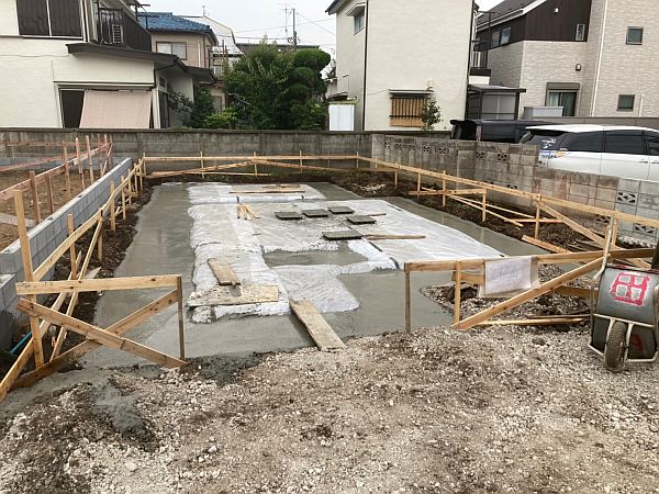 転圧した敷地の上に防湿シートを敷いて、さらに捨てコンクリートを打った状態。防湿シートは地面の湿気から基礎を守るためのもの。捨てコンクリートは型枠を設置しやすくするための地ならしのような工程です。このあたりの作業もほとんどの建築会社で共通だと思います。