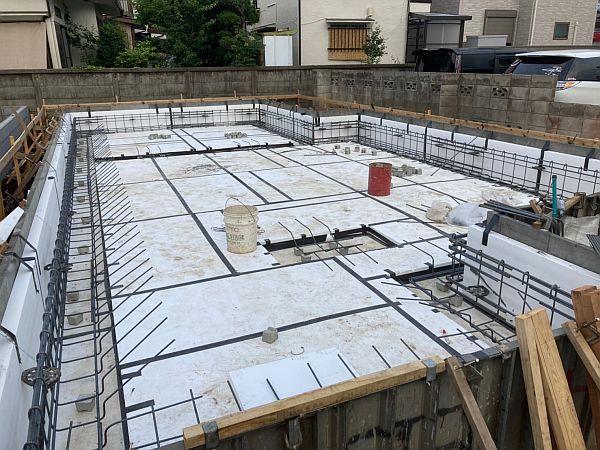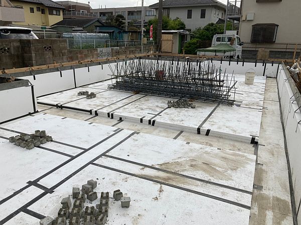 そうしてできあがったO様邸の基礎。基礎の外周部の白いボードはパフォームガードです。このように断熱材で基礎の下側と外側を覆うのが基礎断熱の特徴です。