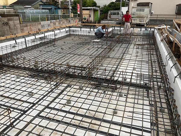 配筋工事、完了!写真の真ん中あたり、基礎の配筋が密になっている部分がありますが、これは地中梁です。耐震等級3を取得するために必要な構造体です。