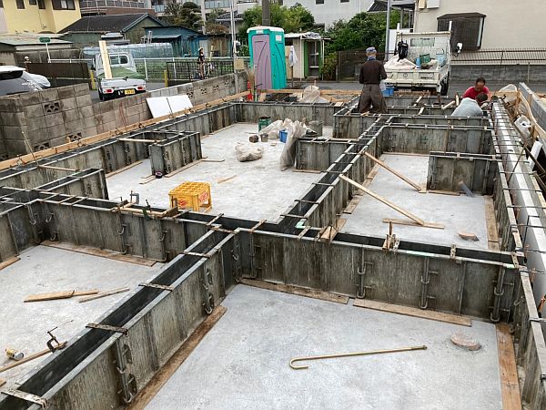 立ち上がりの型枠を組んでいるところです。型枠を組み終えたら、その中にコンクリートを打っていきます。コンクリートが乾いて、型枠をバラしたら、基礎完成となります。