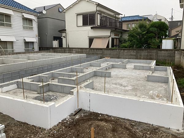 もう一枚、できたてホヤホヤのO様邸の基礎の写真。断熱材と基礎のコンクリートが一体化しているのがわかりますでしょうか。