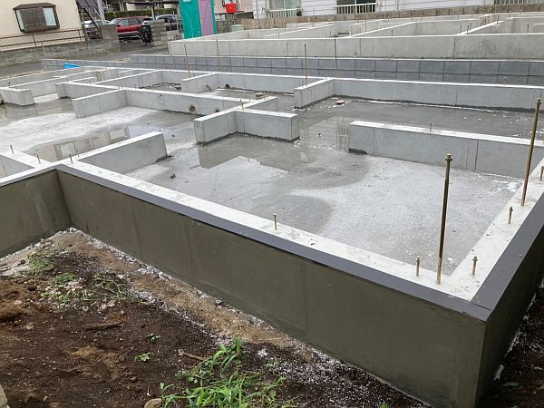 その後、パフォームガードを保護するために、上端部に板金を施工し、側面にベースコートという保護塗料を塗ります。これで基礎工事、完了です!