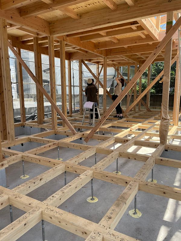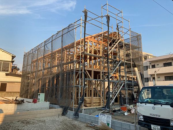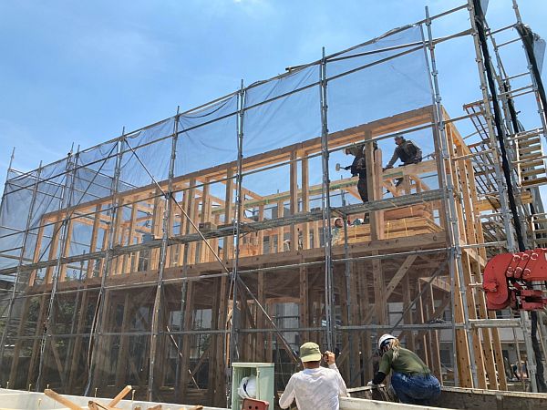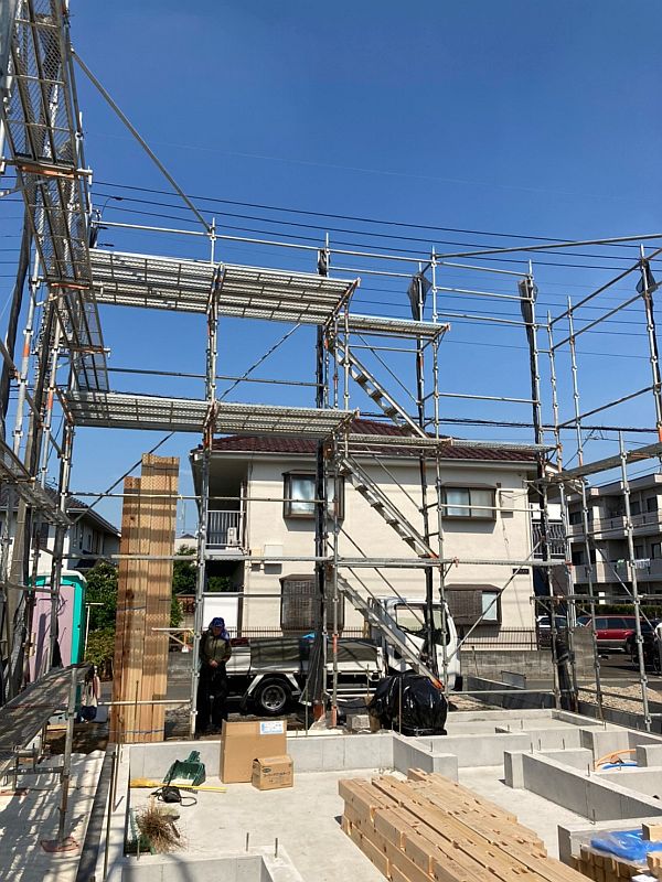 基礎ができあがると、すぐに上棟の準備が始まります。現場には構造材が続々と搬入され、同時に足場も組んでいきます。