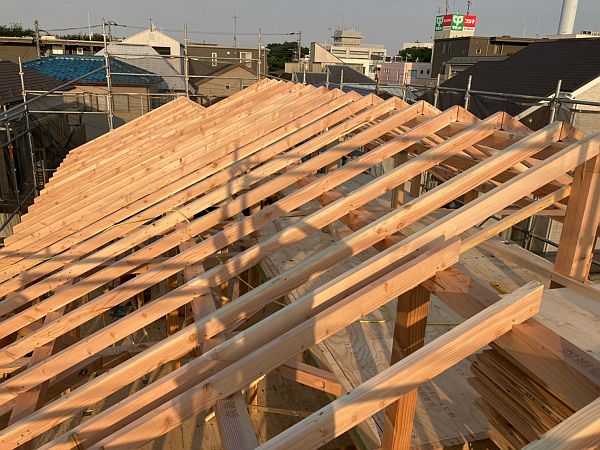 屋根組みまで終わると上棟完了です!夏は日が長いので工事がはかどります。(職人さんは暑くて大変ですが。。。)