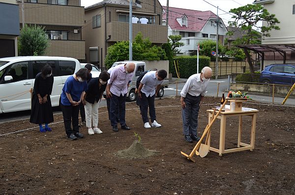 続いて地鎮祭の様子。神主さんをお招きして本格的な地鎮祭を行うこともありますが、今回はお供え物や鍬(くわ)やスコップなどを弊社でご用意させていただき、社内で祈願をし、誓いの言葉を述べる自家製手作り地鎮祭です。少々簡易な地鎮祭ではあるものの、大切なのは気持ち。土地の神様にはしっかりと願い(工事の安全とご家族の繁栄)は伝わったと思います。