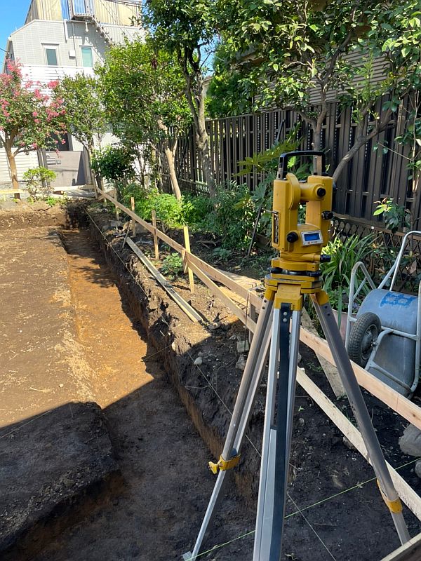 遣り方を基準に、根切りを進めていきます。根切りというのは、基礎を作るために地面を掘り下げる工程のことです。下の写真の黄色い機械はトランシットという角度を測る道具です。変形五角形の敷地に角度をつけて建物を配置するので、この機械の出番となりました。建築の現場もハイテク機器のおかげで日々便利になっています。