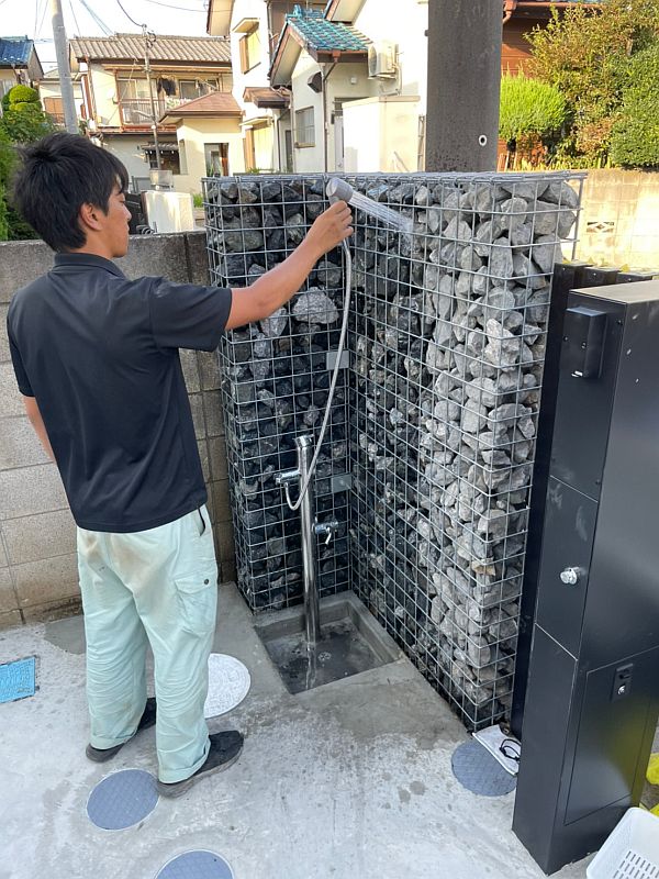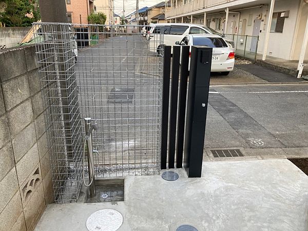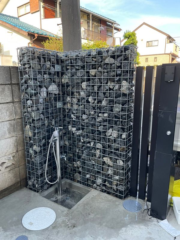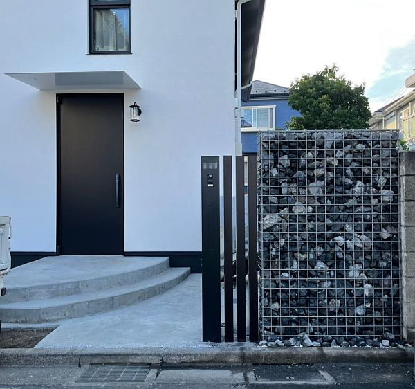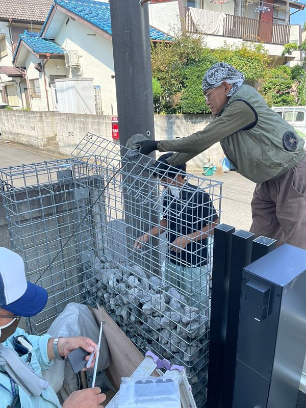 もうひとつは機能門柱の横のガビオンです。外構のアイデアとして取り入れる方が増えてきているガビオンですが、工事は思っていた以上に大変でした。