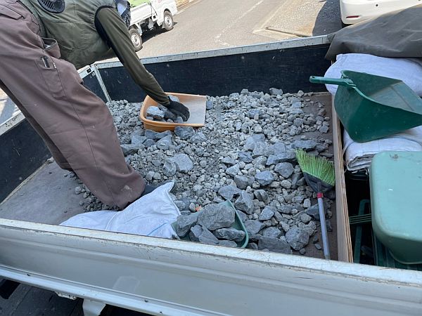 ひとつずつワイヤーメッシュの中に入れていきます。見ているだけで腰が痛くなりそうな作業です。