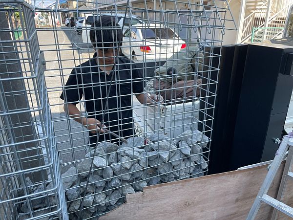時間を少し巻き戻して、砕石を入れる前のガビオンです。枠組みとなるワイヤーメッシュですが、きちっと垂直に寸法通りに設置する必要があり、注意深く作業する必要がありました。このあと、ワイヤーメッシュの中に砕石を入れていきます。
