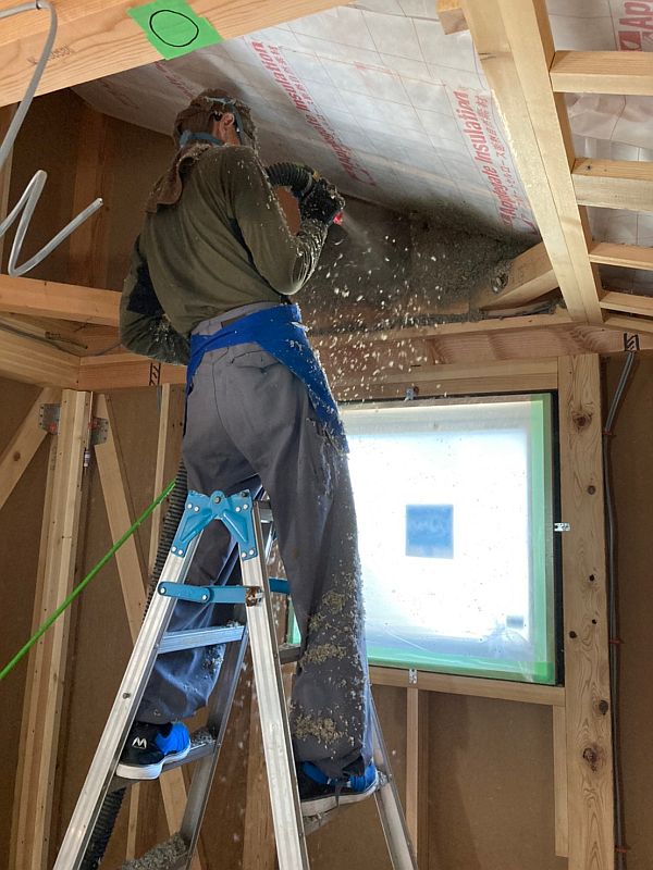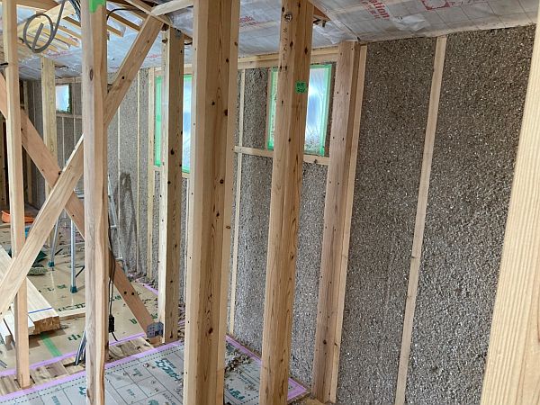下の写真は、断熱材のセルロースファイバーを壁に向かって勢いよく吹き付けている様子です。小野寺工務店では充填断熱(内断熱)用の断熱材としてアップルゲート社のセルロースファイバーを使用しています。このセルロースファイバーには、トウモロコシから生成された微量の糊(のり)成分が入っていて、吹き付ける際に水分を含ませることで、壁にビッタリと隙間なくくっついて、セルロースファイバーの弱点である経年沈下が起きない仕組みになっています(ウォータースプレー工法といいます)。