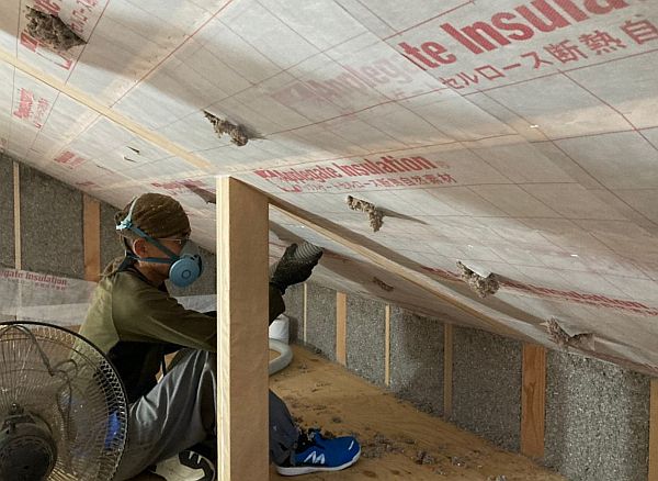 屋根裏にセルロースファイバーを吹き込む職人さん。屋根裏の場合は、専用のシートを貼って、そのシートに穴をあけて、その穴からセルロースファイバーを吹き込んでいきます。