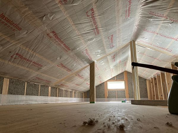 隙間なく充填されたセルロースファイバー。断熱性能はもちろん、調湿性と吸音・防音性にも優れていて、断熱工事が終わると現場の空気が少し変わります。なんというか、空気が少し澄んで、工事の音が響きにくくなります。
