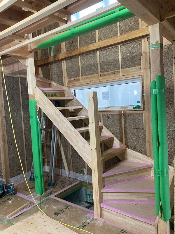 断熱工事が終わると、大工工事・造作工事が一斉に始まります。階段もできあがりつつあります。