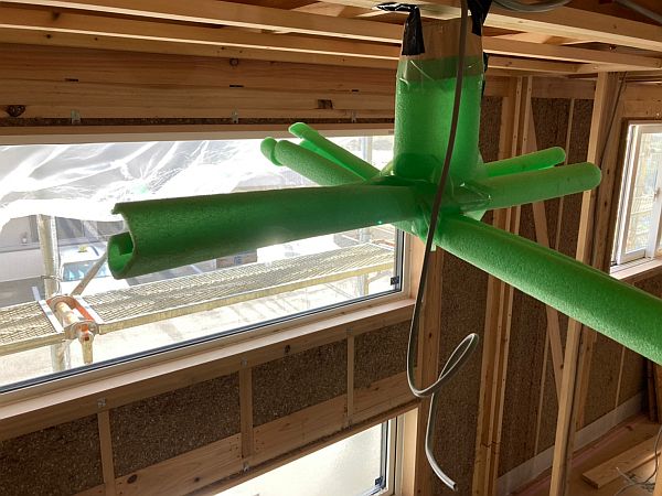 吹き抜けの天井に吊り下げたシーリングファンの模型。お客様がシーリングファンをどのあたりに付けるか迷われていたので、それなら模型を作っていろんな場所に付けてみましょう、ということで作りました。(柱などを養生するカバーで作った緑色の物体がそうです。^^ )ガムテープでいろんな場所に吊り下げて、ここがベスト!という位置を見つけることができました。めでたしめでたしです。
