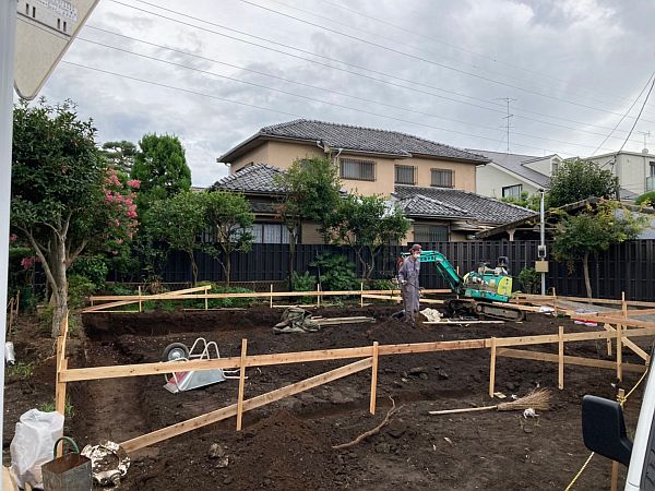こちらがK様邸の建築予定地です。基礎を作るために根切りを行っているところです。周囲に植栽がたくさん残っていますが、K様邸の敷地は風致地区にあるので、植栽をある程度残しておかないと建て替えができないのです。